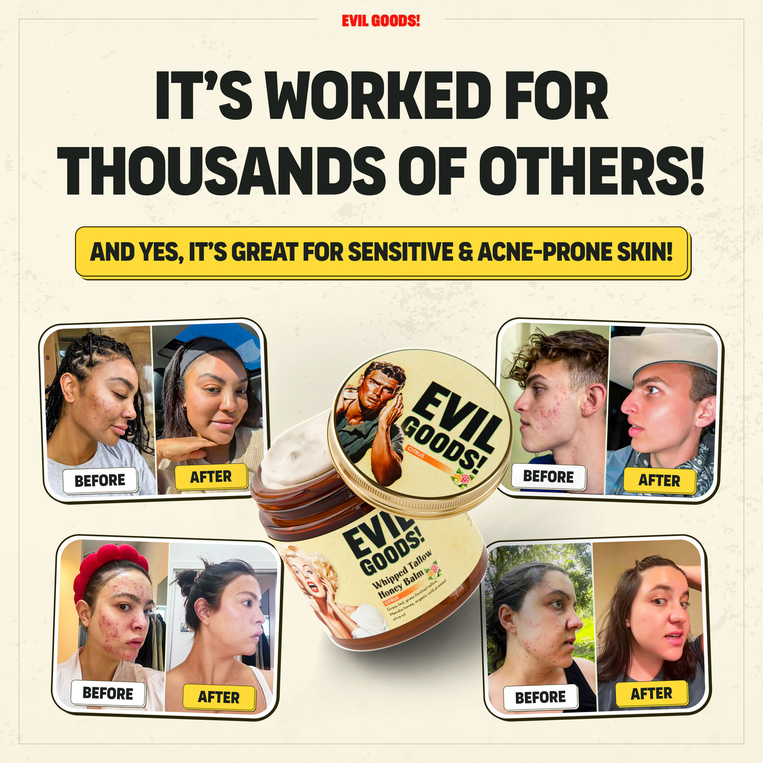 Nope! Our tallow balm is perfect for the face. Its natural composition closely mirrors your skin’s own cells, so it nourishes deeply without clogging pores. Regular use can help balance oil production, calm irritation, and smooth the look of fine lines, leaving your skin soft, healthy, and radiant—naturally.